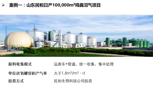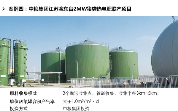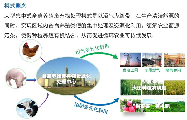 大型集中式畜禽養(yǎng)殖廢棄物處理模式主要有三大特點(diǎn):一是糞污統(tǒng)一收集、集中處理;二是,第三方專業(yè)公司加入的商業(yè)化模式;三是全產(chǎn)業(yè)鏈統(tǒng)籌推進(jìn)。通過“專業(yè)的人做專業(yè)的事”,整合多種技術(shù)模式,實(shí)現(xiàn)產(chǎn)品多元化利用,使沼氣工程中物質(zhì)流、能量流及利益流合理健康運(yùn)轉(zhuǎn),沼氣工程本身具備造血功能,并能進(jìn)行商業(yè)化復(fù)制。壽總報(bào)告中以山東民和日產(chǎn)100,000m3雞糞沼氣項(xiàng)目、江蘇大豐畜禽糞污處理中心20,000m3生物天然氣項(xiàng)目、新疆呼圖壁中廣核36,600m3沼氣提純項(xiàng)目、中糧集團(tuán)江蘇金東臺2MW豬糞熱電肥聯(lián)產(chǎn)項(xiàng)目4個(gè)項(xiàng)目為例,從原料收集、沼氣高值利用、沼肥高值利用、經(jīng)濟(jì)效益等方面闡明了大型集中式畜禽養(yǎng)殖廢棄物處理模式的運(yùn)行機(jī)制和技 術(shù)優(yōu)勢,這些成功案例表明該模式技術(shù)可行、可復(fù)制、易推廣,有效促進(jìn)區(qū)域內(nèi)畜禽養(yǎng)殖廢棄物資源化利用。